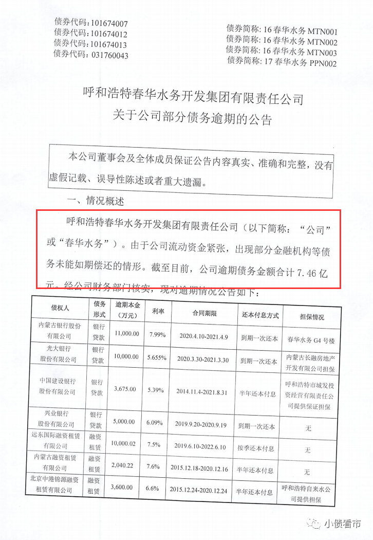 4月30日,呼和浩特春華水務(wù)開發(fā)集團(tuán)有限責(zé)任公司(以下簡稱“春華水務(wù)”)公告稱,由于公司流動資金緊張,出現(xiàn)部分金融機(jī)構(gòu)等債務(wù)未能如期償還的情形。