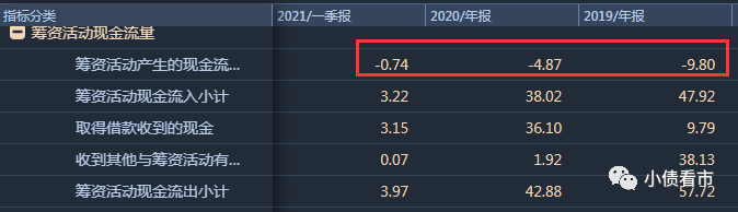 2020年和今年第一季度,春華水務(wù)籌資性現(xiàn)金流凈額分別為-4.87億和-0.74億元。