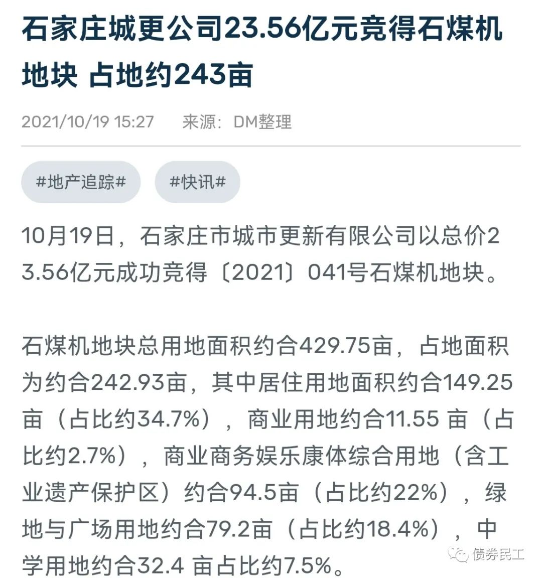 2021年10月19日,石家莊國(guó)控投資集團(tuán)有限責(zé)任公司的孫公司石家莊城市更新有限公司以23.56億元的價(jià)格摘得石家莊市總出讓面積為242.93畝的土地,包含居住用地、商業(yè)用地等。
