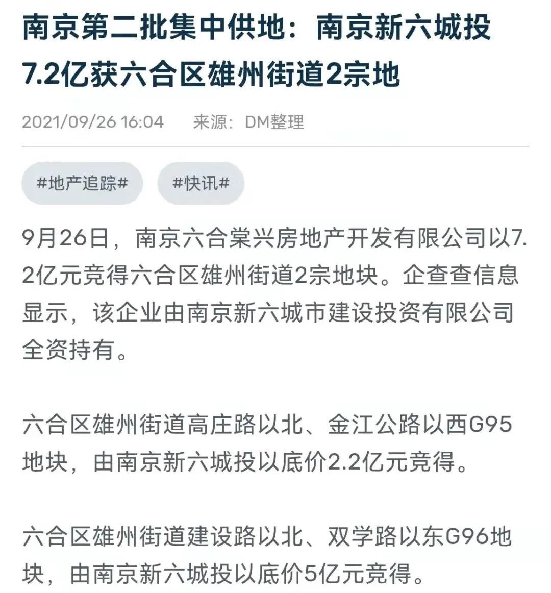 2021年9月26日,南京新六城市建設(shè)投資有限公司的子公司以7.2億元的價(jià)格摘得南京市六合區(qū)雄州街道的2宗土地。