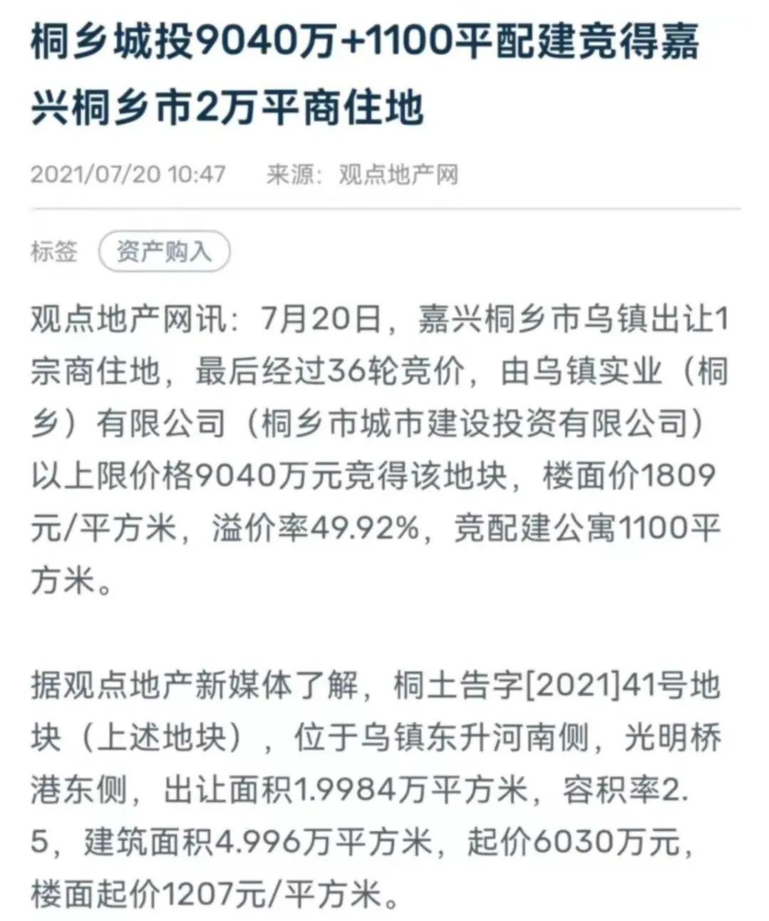 2021年7月20日,桐鄉(xiāng)市城市建設(shè)投資有限公司以9040萬(wàn)元的價(jià)格摘得嘉興桐鄉(xiāng)市烏鎮(zhèn)總出讓面積為1.9984萬(wàn)平方米的商住地。