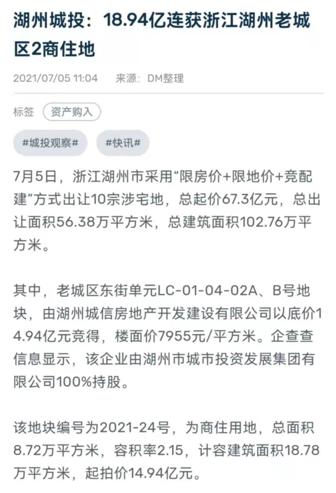 2021年7月5日,湖州市城市投資發(fā)展集團(tuán)有限公司的子公司以18.94億元的價(jià)格摘得浙江湖州市總出讓面積為8.72萬(wàn)平方米的商住地。