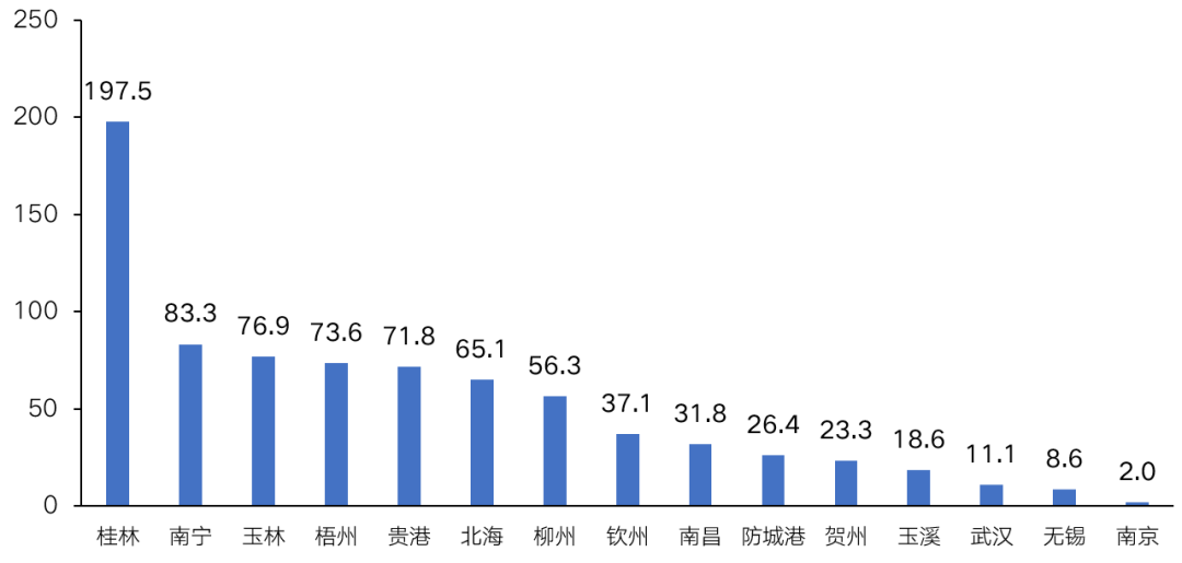 據(jù)公告披露信息顯示,此次收購涉及目標項目共57個,包含54個開發(fā)項目及3個代建項目,總計容未售建筑面積為825.17萬平方米。其中,54個開發(fā)項目計容共計未售建筑面積783.33萬平方米,90.8%位于廣西各城市核心區(qū)域,主要分布在桂林、南寧、玉林等城市,且以住宅為主,流動性強。