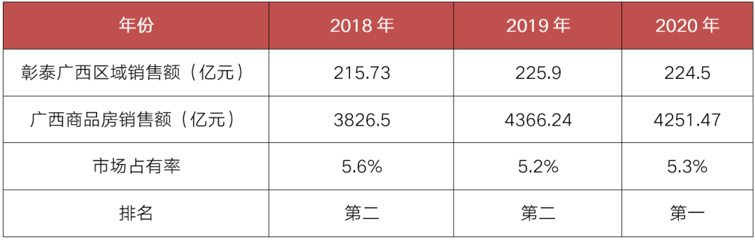 彰泰作為廣西規(guī)模最大的本土房企,2018-2020年連續(xù)三年銷售額均超過200億元,其中2020年在廣西區(qū)域全口徑銷售額達224.5億元,權益銷售金額達161.4億元,均位列第一。根據(jù)廣西2020年商品房銷售額4251.5億元計算,市場占有率約為5%,超過碧桂園位居首位。今年一季度,彰泰繼續(xù)以47.44億元領跑,增長預期向好。