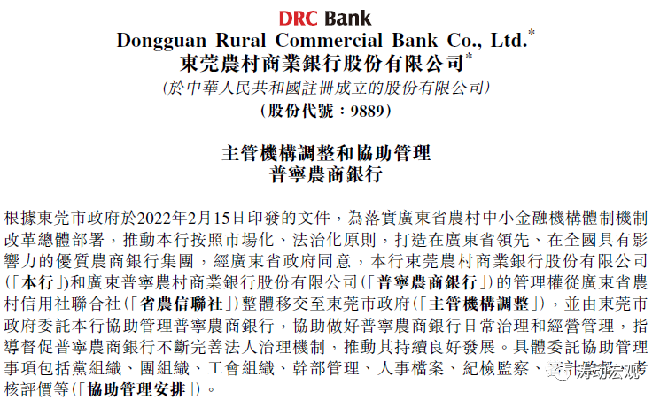 (一)2022年2月16日,港股上市銀行東莞農(nóng)商行(9889.HK)發(fā)布公告明確,根據(jù)2022年2月15日東莞市政府印發(fā)的文件,東莞農(nóng)商行與普寧農(nóng)商行的管理權(quán)從廣東省聯(lián)社整體移交至東莞市政府,同時(shí)東莞市政府委托東莞農(nóng)商行協(xié)助管理普寧農(nóng)商行。考慮到之前的廣州農(nóng)商行與深圳農(nóng)商行亦已脫離廣東省聯(lián)社管理,這意味著繼直轄市方案(即單一銀行模式)、浙江方案(即聯(lián)合銀行模式)、陜西與寧夏方案(即銀行控股模式)之后,廣東省聯(lián)社的方案(即金融服務(wù)模式)也基本得以明確,充分體現(xiàn)出“一省一策”的改革思路。