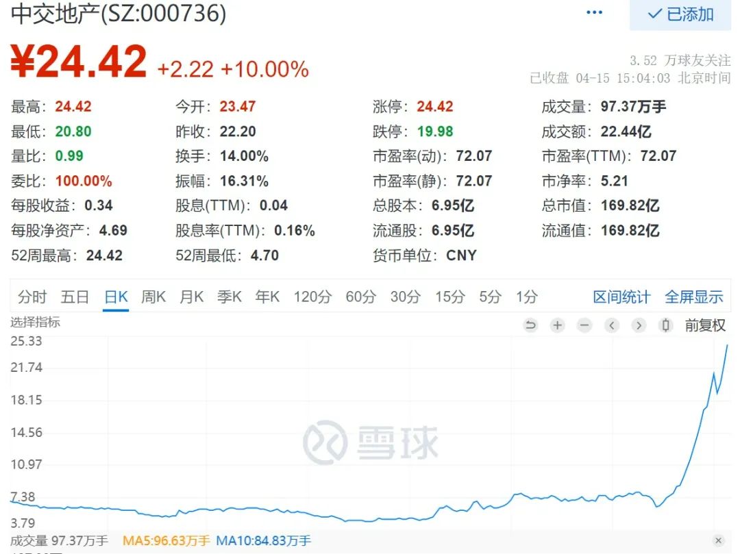 2022年第一個堪稱“妖股”的地產(chǎn)股——中交地產(chǎn)(000736.SZ)已經(jīng)“瘋狂”了一個月。