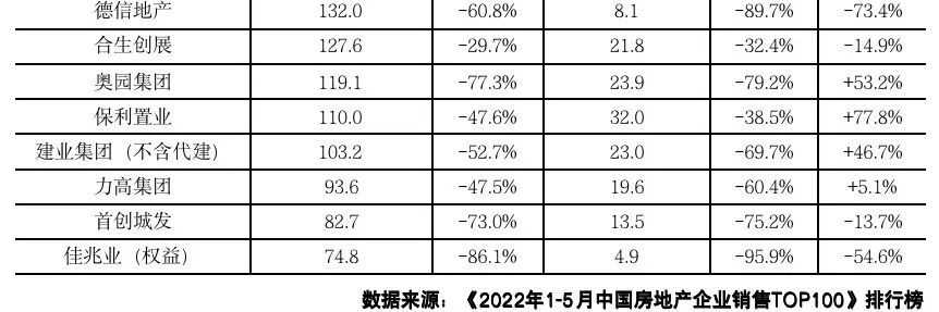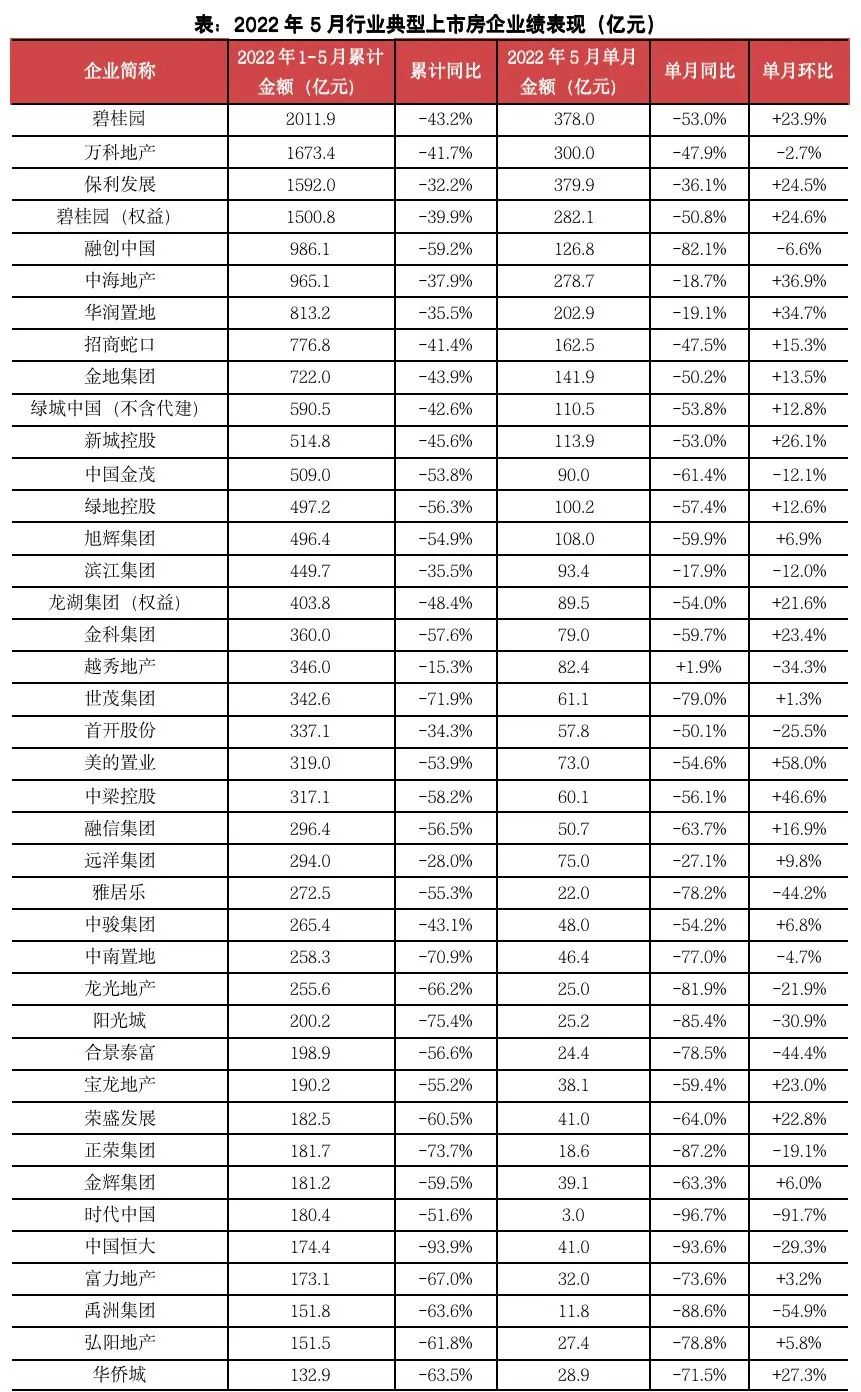 1、2022年5月,行業下行壓力持續、疊加部分城市疫情反復,市場信心不足、企業表現仍相對低迷。TOP100房企單月實現銷售操盤金額4546.7億元,較上年同期降低59.4%。但得益于各地樓市紓困政策,加之“五一”假期房企推盤及營銷積極性提升,環比增長5.6%。累計業績來看,百強房企1-5月的整體操盤業績規模同比降低52.3%,降幅較上月進一步擴大。