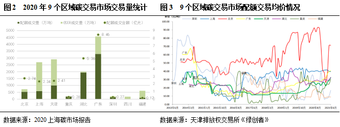 從2020年全國9個區域碳交易市場交易量來看,參考《2020上海碳市場報告》,2020 年,全國9個區域碳市場總交易量1.41 億噸,其中,配額成交量0.78億噸,CCER成交量0.63億噸。廣東碳交易市場成交量最大,接下來是天津、上海、湖北,其余碳交易市場成交量相對較小。配額交易價格方面,北京碳交易市場均價最高,2020年全年均價為51.41元/噸,其次是上海,2020年全年均價為30元/噸。各區域碳交易市場交易價格差別較大與各區域納入碳交易的行業范圍、標準、地區產業結構等多方面有關。