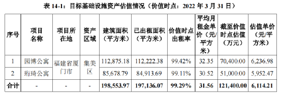 根據(jù)國融興華出具的初始評(píng)估報(bào)告,截至2022年3月31日,投資性房地產(chǎn)資產(chǎn)組價(jià)值為70,400.00萬元和51,000.00萬元,合計(jì)為121,400.00萬元,折合單價(jià)分別為6,237元/平方米和5,952元/平方米。