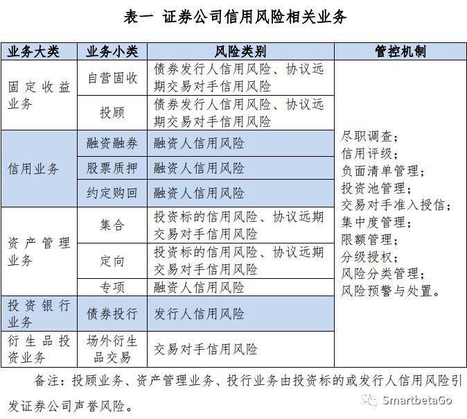 證券公司涉及到信用風險的業(yè)務條線較多,如下表一所示: