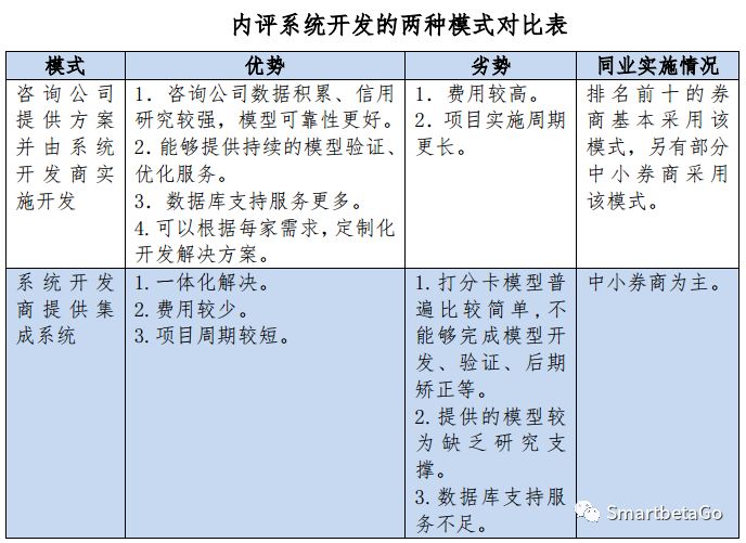 由于證券公司存在數據缺失和內部研究能力不足等問題,目前證券行業(yè)實施內部信用評級系統(tǒng)建設主要采用以下兩種模式:一是咨詢公司提供咨詢方案并由系統(tǒng)開發(fā)商實施開發(fā)的模式,業(yè)內排名靠前的大券商普通采用該種模式;二是系統(tǒng)開發(fā)商提供集成系統(tǒng)的模式,中小券商較多采用該模式。上述兩種主要模式的對比情況詳見下表: