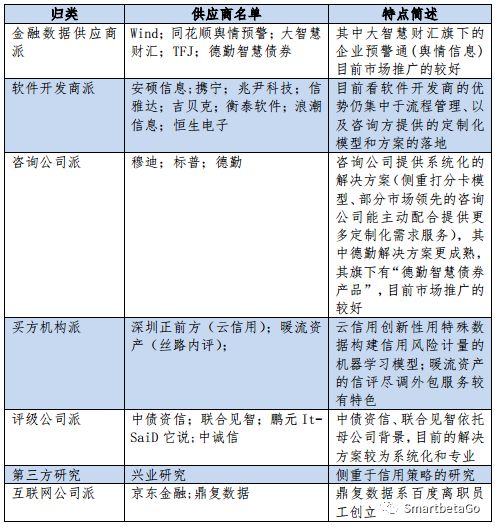 隨著信用債市場違約的爆發(fā),2018年信用債違約120只,涉及金額1176.51億元,創(chuàng)下2014年債券違約元年以來的最高值:數量上,120只與前4年總和(2014年-2017年)122只幾乎持平;規(guī)模上,1177億元比前4年總和860億元高出約36.9%。信用債違約的爆發(fā)一方面催生了買方對信評的崗位需求,另一方面也催生出眾多針對信用債領域的各個方面的解決方案提供商,筆者對這些提供商進行了全市場調研和歸類,如下: