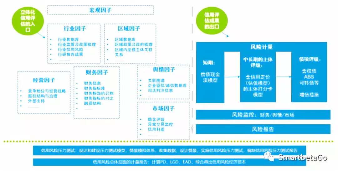 三、管理機制通過十個模塊的合力,達到監(jiān)管要求的可監(jiān)測、能計量、能分析、可應對。而其中核心的是通過立體化內評體系提升前臺信評的風險識別和風險計量能力、輔助中臺信用風險管理工作。