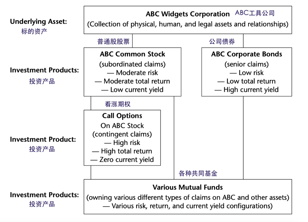 為了匹配不同投資者的需求,投資行業(yè)創(chuàng)造了各種投資產(chǎn)品和工具。在這個(gè)系統(tǒng)中,分為兩部分:標(biāo)的資產(chǎn)和投資產(chǎn)品或工具。