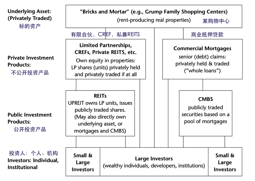 第二層的投資產(chǎn)品,則是在上面一層衍生出來(lái)的,可以公開(kāi)市場(chǎng)交易的,REITs(房地產(chǎn)投資信托)和CMBS(商業(yè)抵押貸款支持證券)。