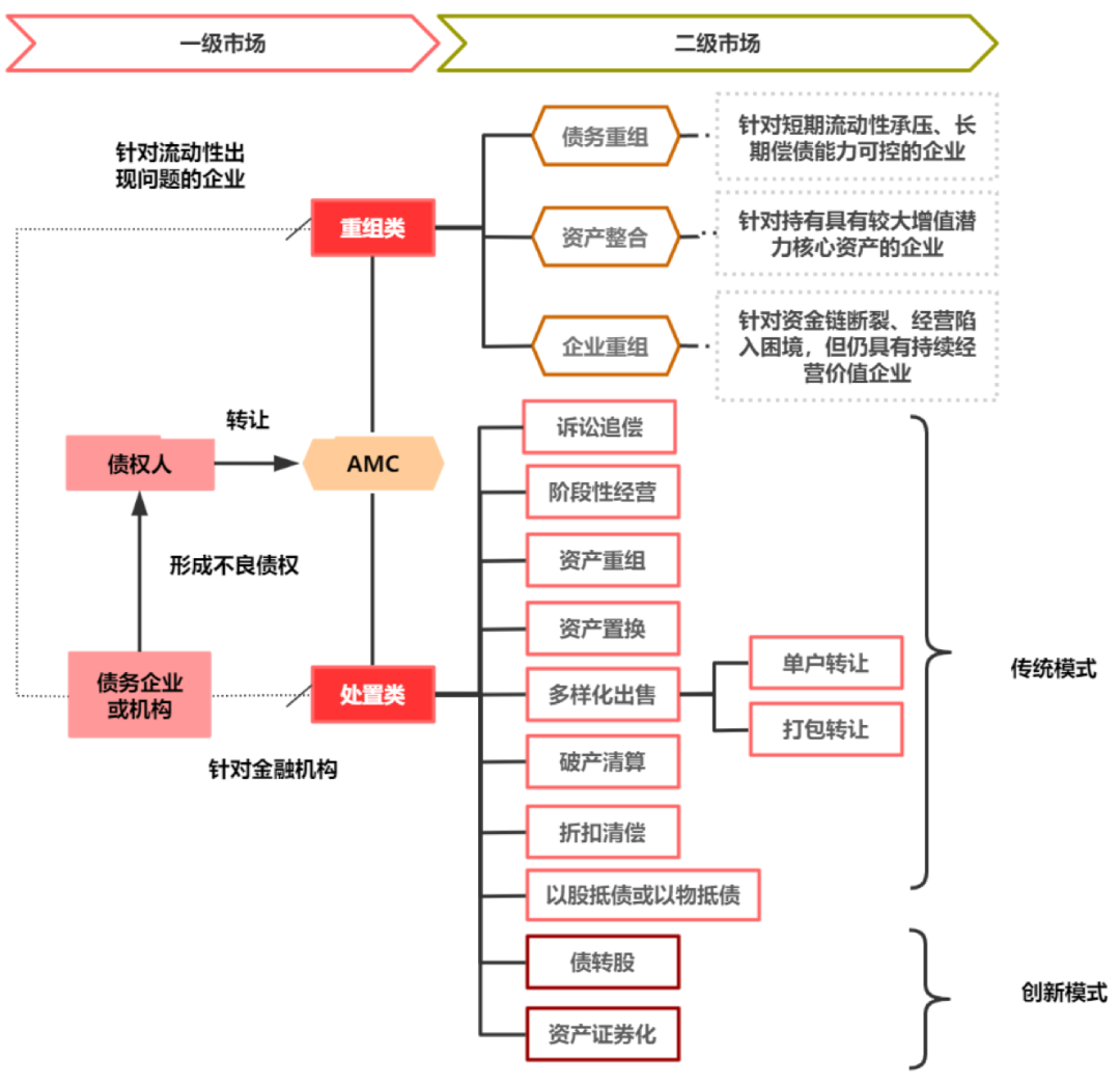 AMC的不良資產(chǎn)處置模式主要分為收購處置類業(yè)務(wù)和收購重組類業(yè)務(wù)。其中,涉房類不良資產(chǎn)以信托貸款、委托貸款和各類應(yīng)收賬款的債權(quán)資產(chǎn)為主,歸屬于重組類業(yè)務(wù)。