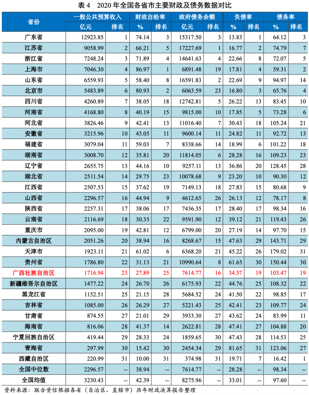 2018-2020年底,廣西自治區政府債務規模持續增長,分別為5488.96億元、6328.42億元和7614.77億元。截至2020年底,廣西自治區政府債務規模居全國第16位。2018-2020年底,廣西自治區政府負債率持續上升,截至2020年底為34.37%,在全國各省(自治區、直轄市)中排名中下游(按照債務負擔輕重排序),債務負擔相對較輕。同期,廣西自治區政府債務率逐年增長,截至2020年底為103.47%,在全國各省(自治區、直轄市)中排名中下游(按照償債能力強弱排序),償債能力一般。