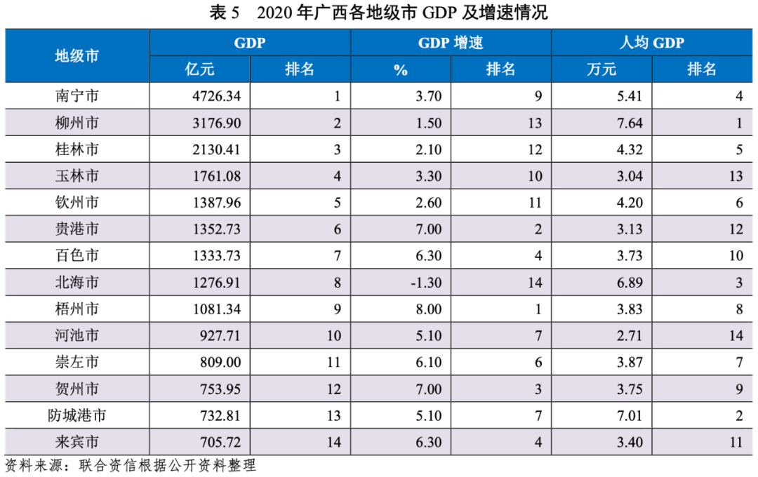 從GDP增速來看,2020年,梧州市、貴港市、賀州市、百色市、來賓市和崇左市6個地級市GDP增速達到6.00%及以上;玉林市、欽州市、桂林市、柳州市和北海市的GDP增速低于全省平均水平,不足3.70%,其中北海市的GDP增速為負。從人均GDP看,柳州市、防城港市和北海市3個地級市2020年人均GDP均超過6萬元,最高為柳州市(7.64萬元),河池市2020年人均GDP不足3萬元,其他10個地級市人均GDP水平在3~6萬之間。