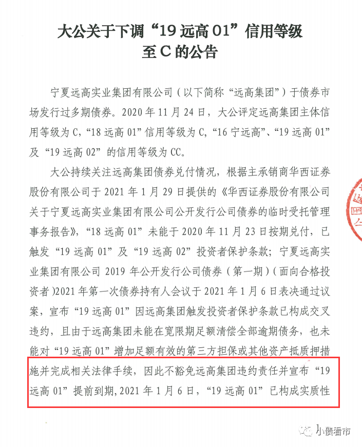 由于遠(yuǎn)高集團(tuán)未能在寬限期足額清償全部逾期債務(wù),也未能對(duì)“19遠(yuǎn)高01”增加足額有效的第三方擔(dān)保或其他資產(chǎn)抵質(zhì)押措施,因此該債提前到期,2021年1月6日“19遠(yuǎn)高01”已構(gòu)成實(shí)質(zhì)性違約。