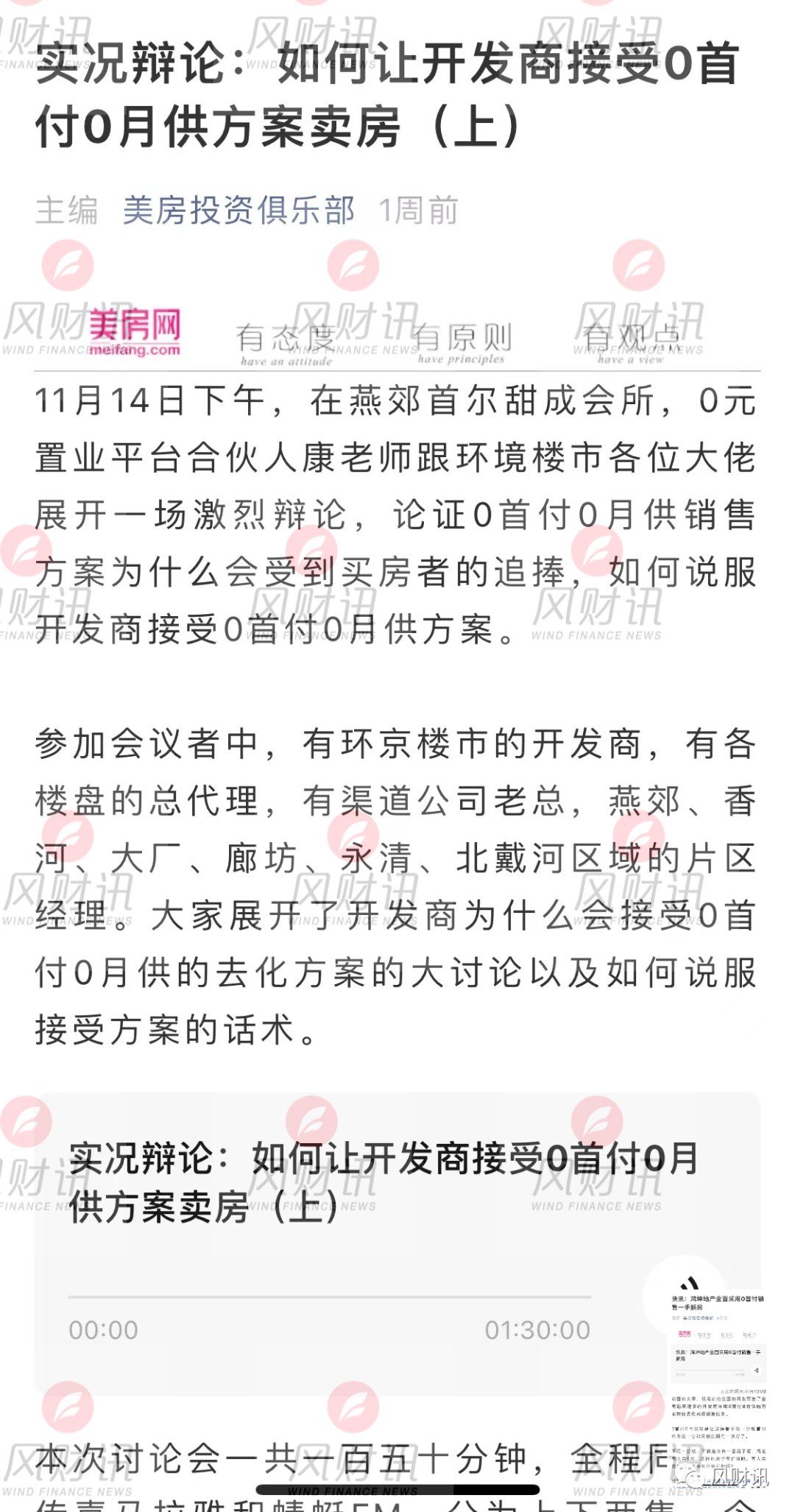 顯然,這也是一場(chǎng)“成功”的秘密會(huì)議。僅過(guò)了8天之后,11月22日,美房網(wǎng)便欣然官宣:鴻坤地產(chǎn)將全面采用0首付銷(xiāo)售一手新房。
