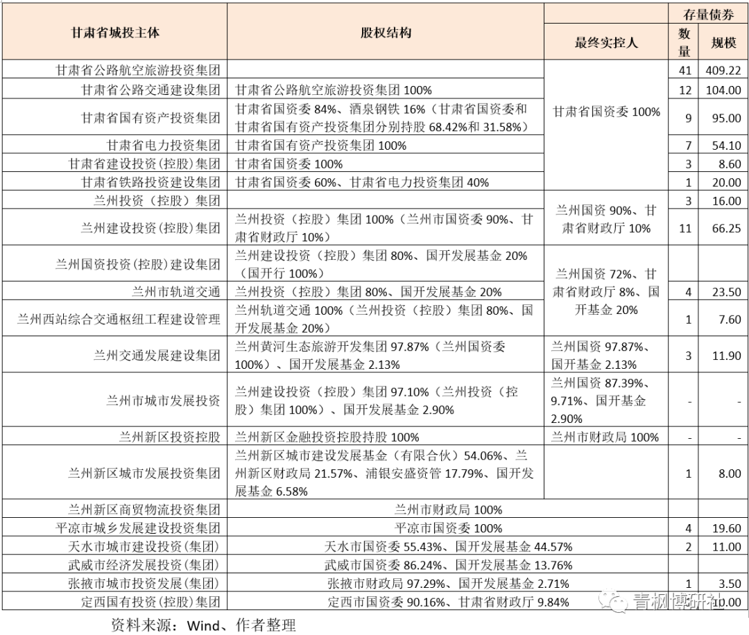 (1)層級上看,省級平臺均為甘肅省國資委最終100%控股,蘭州市級平臺穿透后要么為甘肅省國資委控股,要么為蘭州市國資委控股。