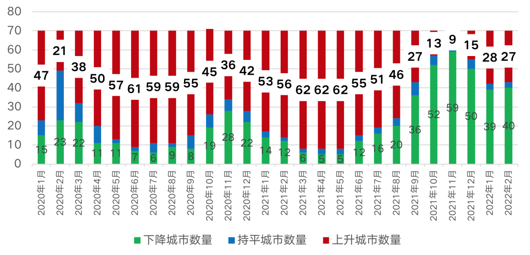 值得注意的是,2月只有27個城市房價環(huán)比上漲,較去年同期減少了五成之多,房價下跌的城市多達40個,而去年同期僅12個城市房價下跌。