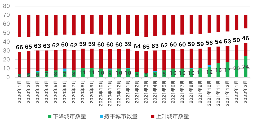 從房價上漲城市數(shù)量來看,自2020年1月以來,房價同比上漲城市數(shù)量不斷減少,2月新建商品住宅同比上漲城市有46個,較2020年1月減少29%。