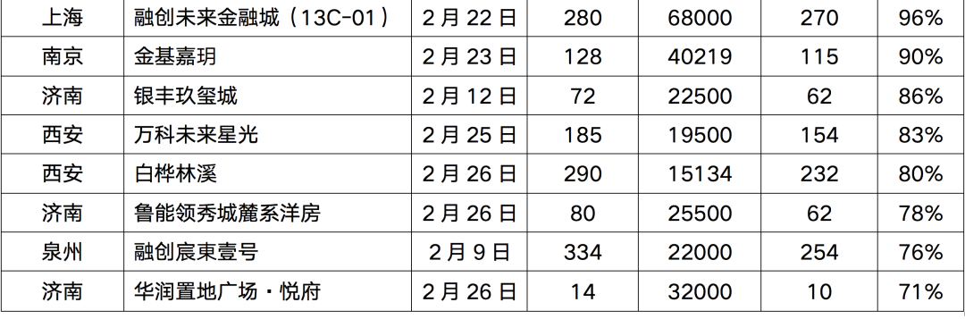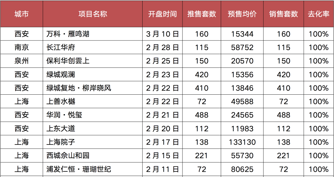 從CRIC監(jiān)測的2月以來不同城市去化率大于70%的19個項目來看,一線城市上海占5席;而基本面良好的內陸二線城市西安有7個項目去化大于70%,去化達到100%的項目就有5個。此外,東南沿海核心二三線城市泉州表現(xiàn)亮眼。