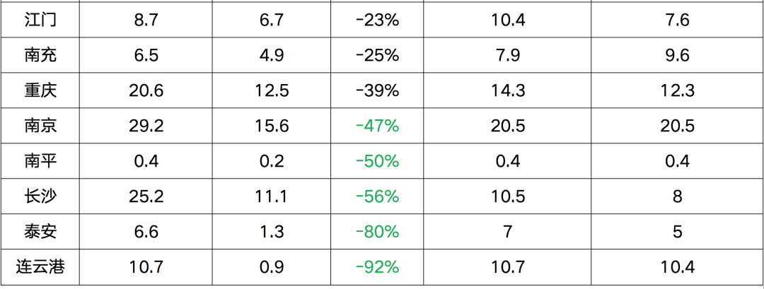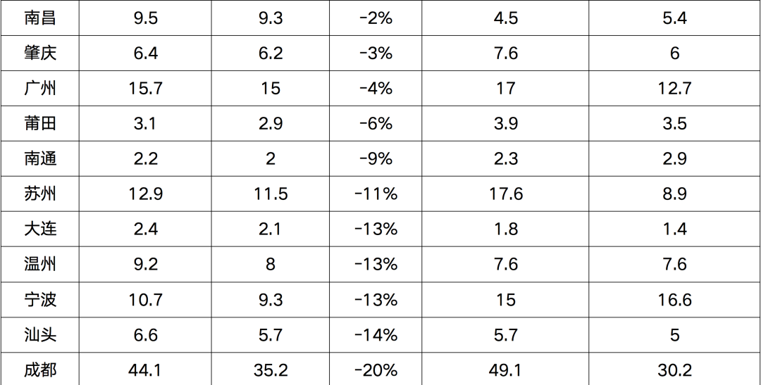 整體而言,各等級城市房價均呈現(xiàn)漲幅回落或跌幅擴大跡象,大部分二三線城市市場仍較為低迷。