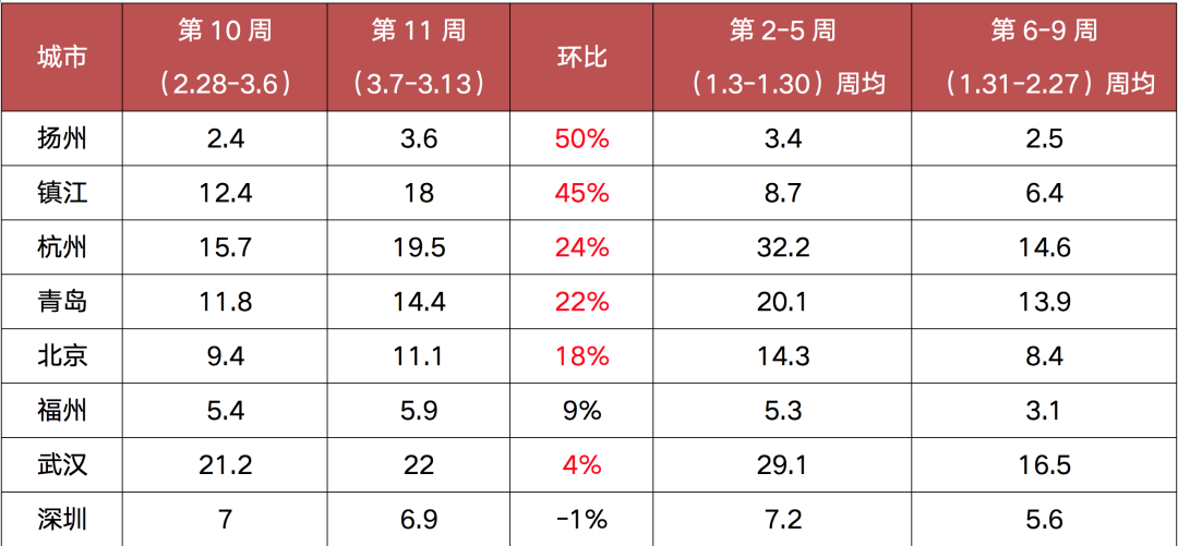 從新房市場周成交數(shù)據(jù)也可以看出,整體成交走勢延續(xù)小幅下行趨勢,但東南沿海核心二三線城市和基本面良好的內陸二線城市已出現(xiàn)回暖苗頭。以武漢、杭州、青島、北京、揚州等為典型代表,杭州、青島第11周環(huán)比漲幅均超20%,一線城市中北京第11周環(huán)比漲幅也達18%。回落城市以基本面較差的三四線城市為主,長沙、南京則迎來階段性回調期。