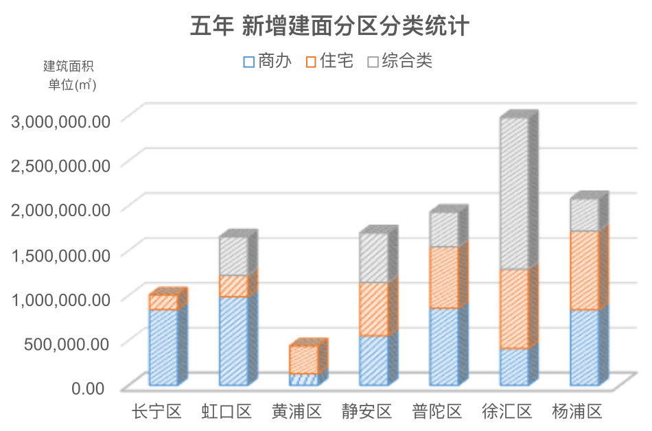 圖:近五年上海核心區范圍內新增建面分區分類統計