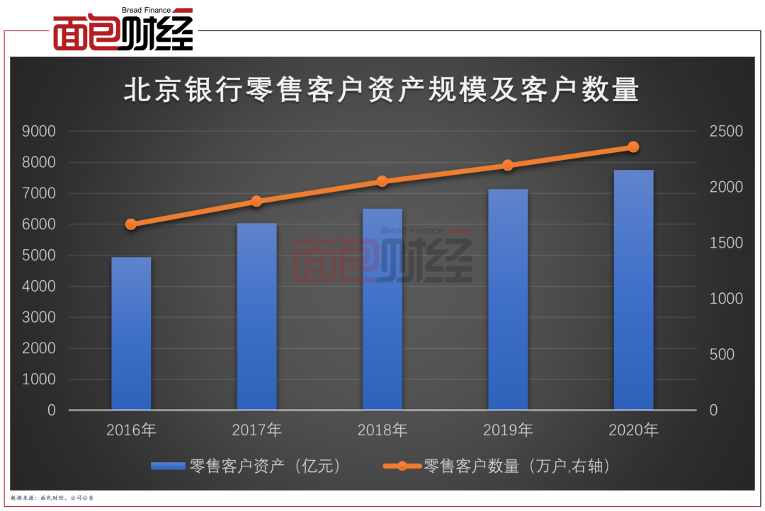 截至2020年末,北京銀行管理的零售客戶資產(chǎn)達到7748億元,較年初增長612億元。零售存貸款規(guī)模分別為3925億元和5050億元,較上年同期分別增加404億元和623億元,增幅分別為11.5%和14.1%。零售客戶達2357.9萬戶,較年初增長163.7萬戶,增幅為7.4%