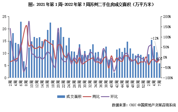 2022年第7周,蘇州二手住房成交面積收至6.9萬平方米,同比跌幅收窄至12%。本周市場成交量正常回調但同比跌幅持續收窄,后續市場短期或有回升。