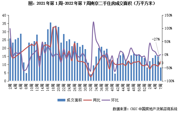 2022年第7周,南京二手住房成交面積收8.8萬平方米,同比跌幅收窄至27%。節后成交規模大幅回落但同比仍有支撐,預計后續市場或企穩回升。