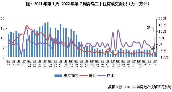 2022年第7周,青島二手住房成交面積同比微增7%,成交規模2.6萬平方米。市場長期嚴控下消費者普遍購房信心不足,當前成交規模仍維持年前低位震蕩。