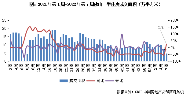 2022年第7周,佛山二手住房成交面積同比收漲24%,成交體量收4.8萬平方米。本周市場成交規模回調但較之去年同期仍有較大漲幅,短期內規模或快速回升至節前水平。