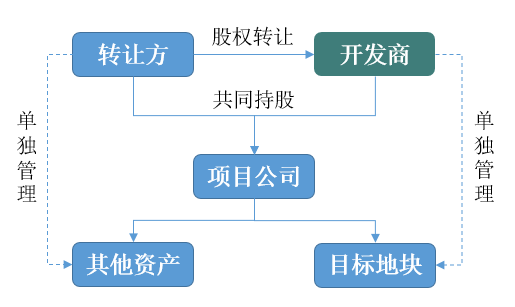 股權轉讓:股權轉讓模式下的交易價款通常包括股權轉讓款與股東借款兩部分,一部分為股權轉讓款;另一部分為開發商向項目公司提供的股東借款,并由項目公司專項用于償還對外負債及原股東借款(含清理往來款)。若無特殊安排,開發商支付全部交易價款后,原股東與開發商投入至項目公司的股東借款比例應與股權比例一致。