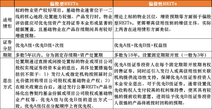 國內“類REITs”產品有兩類主要設計思路,分別為偏股型REITs和偏債型REITs。上述四個項目均為偏債性類REITs。偏股型REITs如 華泰佳越-順豐產業園一期資產支持專項計劃、光證資管-光控安石商業地產第1-X期資產支持專項計劃。