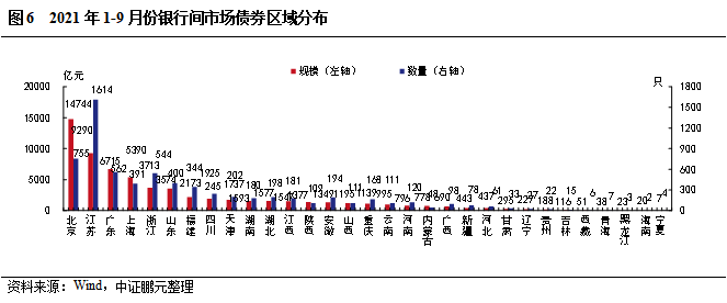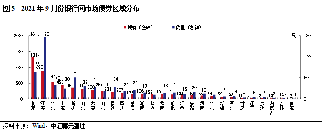 2021年9月份,銀行間市場發行債券廣泛分布于27個省(直轄市、自治區)。從發行規模來看,北京以1,313.50億元的發行規模遙遙領先,江蘇、廣東、上海和浙江位列第二梯隊,發行規模在350-900億元之間。從發行數量來看,江蘇排名第一、北京排名前二,浙江、廣東、上海發行數量緊隨其后,均超過30只。綜合2021年1-9月的情況來看,銀行間市場債券的發行主導區域仍集中在北京、江蘇和廣東等地區。從發行規模來看,北京以14,743.65 億元的發行規模領先于其他省市,江蘇、廣東和上海緊隨其后。從發行數量來看,江蘇發行1,614只,位居第一;北京發行755只,位居第二;廣東發行562只,位列第三。