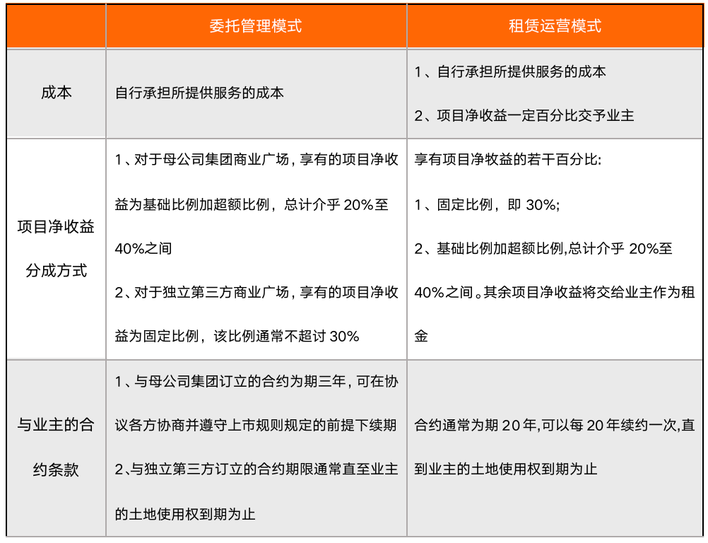 萬達商管在運營模式上采用了委托管理和租賃運營兩種方式,其中委托管理模式主要表現為萬達商管全權負責管理商業廣場。而租賃運營模式主要表現為從業主處承租,并將商業廣場內的商業空間出租于商戶,同時全權負責管理商業廣場。