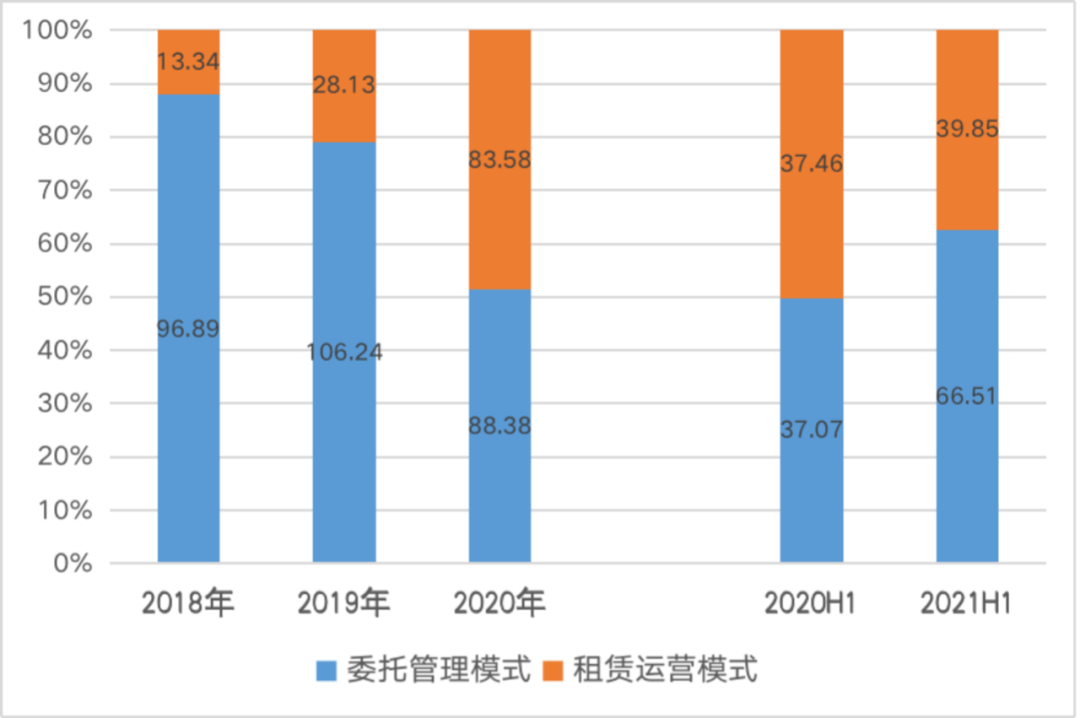 萬達商管2018年至2020年的租賃運營模式收入得到快速增長,主要原因一是第三方管理項目的數量明顯增長,由2018年的23個增長至2020的79個;另一方面2020年由于嘗試將母公司旗下的55個項目也轉為租賃運營模式,因此當年租賃運營模式收入占比大幅提升。不過目前企業280個母公司集團商業廣場仍然轉為委托管理模式,僅118個在管獨立第三方商業廣場中有82個所采用的是租賃運營模式管理。