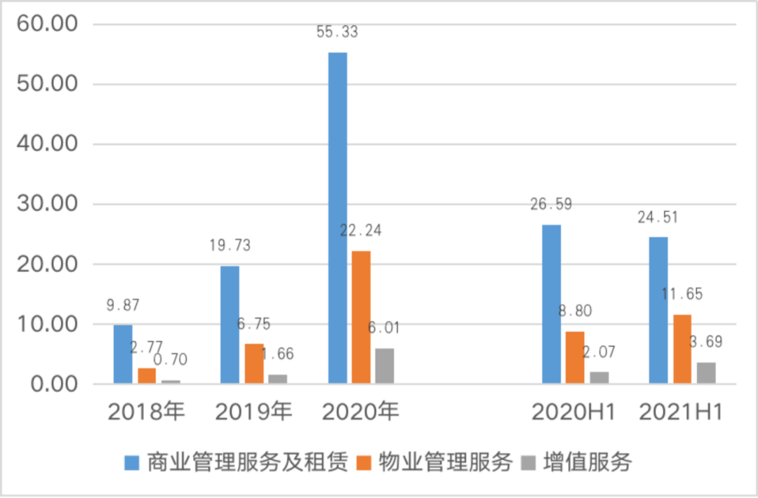 在委托管理模式之下,物業管理服務一直為主要營收來源,收入占比均達到50%以上,而商業管理服務在2021年上半年由不足1億元的營收水平猛增至9.05億元,主要是因為2018年至2020年,委托管理模式下萬達商管并未對運營管理服務收取費用,僅對開業前的咨詢服務進行收費,因此營收較低,自2021年5月開始對運營管理收取服務費以致該部分營收猛增。