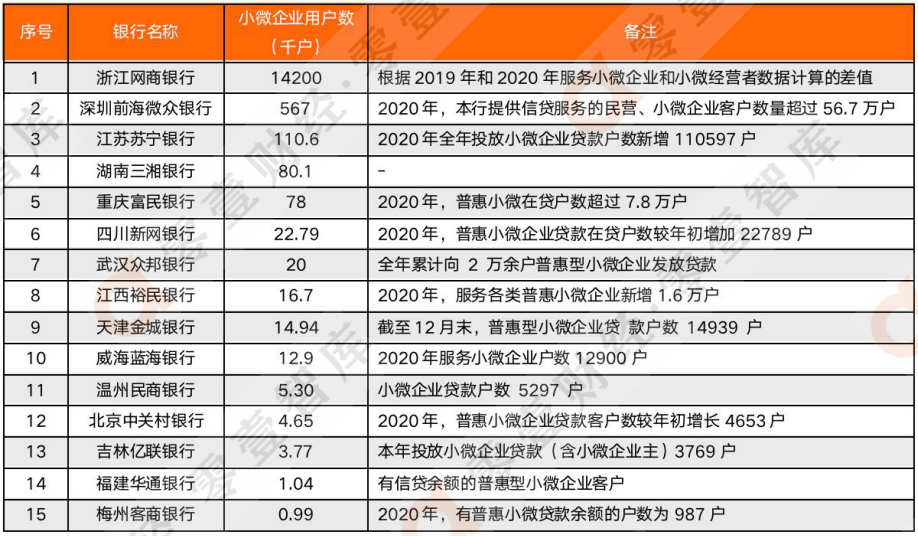 從整體數(shù)據(jù)看,2020年民營(yíng)銀行普惠小微貸款余額共近2600億元,較2019年增幅較大,但相比于2020年末銀行業(yè)普惠小微貸款余額共15.1萬(wàn)億元,占比不足2%,仍有不小的發(fā)展空間。