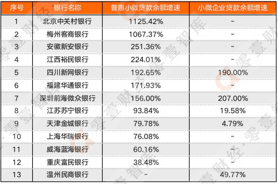 2、 表中主要根據(jù)普惠小微貸款余額增速對(duì)比,部分銀行披露小微貸款余額增速,放在同一表格中對(duì)比。