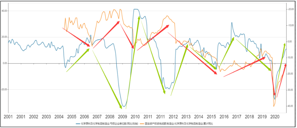 可以簡單梳理其中邏輯:國內(nèi)化工行業(yè)以中低端基礎化工為主,行業(yè)產(chǎn)能相對過剩,因此資本的進入很容易加劇行業(yè)競爭進而影響行業(yè)景氣度。具體表現(xiàn)為,迅速增加的供給能力無法與市場需求匹配,導致行業(yè)階段性過剩,企業(yè)盈利能力隨之下降,虧損企業(yè)數(shù)量增加,同時,預示著行業(yè)景氣度下行。而行業(yè)景氣的下行會逐漸打消潛在資本的進入欲望,直至行業(yè)景氣度的低谷,資本對行業(yè)的投入便不再增加并在之后逐步減少。隨著市場需求增長,市場逐步消化既有產(chǎn)能,供需關系逐步改善,行業(yè)景氣度從低谷上行。