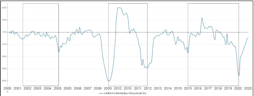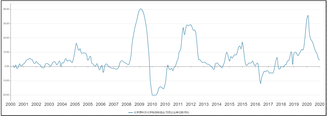 經(jīng)過對多年數(shù)據(jù)分析,雖然每家化工企業(yè)經(jīng)營情況各有不同,但在相對充分市場化競爭的格局下,徘徊在盈虧邊緣化企的變化更能敏感的反映行業(yè)景氣度變動,因此,我們可以用化工行業(yè)虧損企業(yè)家數(shù)同比的變化較為直觀的反映行業(yè)的興衰。我們通過對國家統(tǒng)計局公布的近二十年化學原料及化學制造業(yè)虧損企業(yè)家數(shù)同比數(shù)據(jù)進行整理,繪制出圖1。在圖中可以清晰的看出近二十年國內(nèi)化工企業(yè)虧損數(shù)量在不同時期波動差異較大,同時,也反映出我國化工行業(yè)近二十年行業(yè)景氣度大幅波動的現(xiàn)狀。