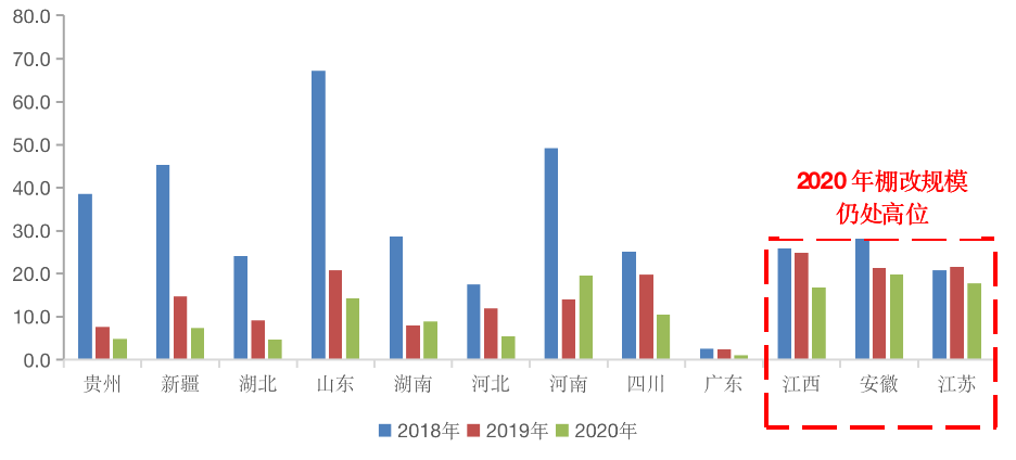 江蘇、安徽和江西等棚改市場規(guī)模整體仍處高位。例如江蘇省,2020年棚改計劃開工17.7萬套,較2018年高峰期下降18%。