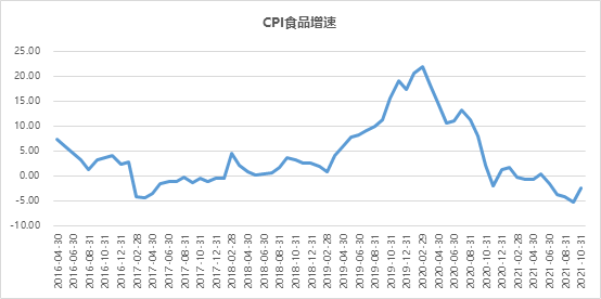 而CPI食品類增速在9月創出-5.2%的階段新低后,10月出現了反彈。豬肉價格下跌拖累了CPI食品項。同樣,近期豬肉價格的反彈也帶動了10月食品項回暖。