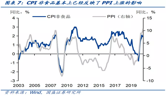 實際上,PPI向CPI的傳導早已就開始。據國盛證券表示,以非食品CPI走勢已反映了工業品價格上升影響,與PPI走勢高度同步。