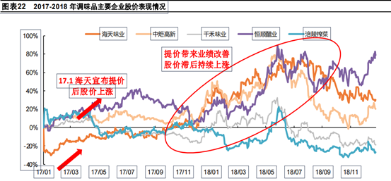 統計上述主要調味品16—18年間股價變動,在提價公布后短期內股價均處于上漲狀態。